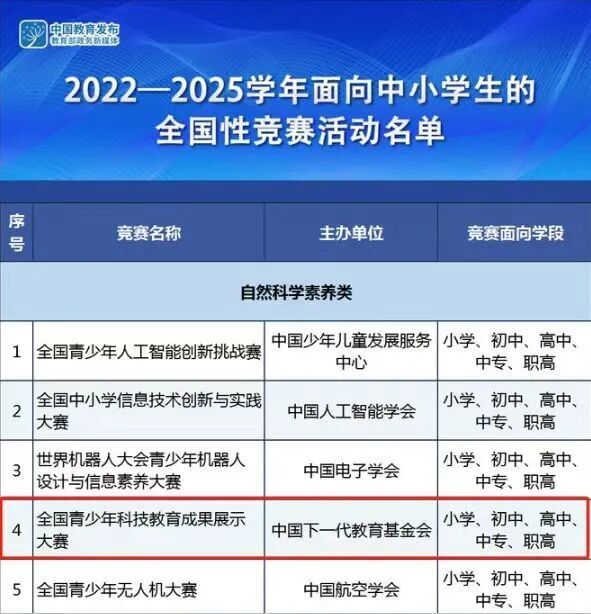 由中国下一代教育基金会主办的全国青少年科技教育成果展示大赛,是经教育部批准,2020年启动的面向中小学生的全国性竞赛活动,简称全国青科赛。2022年9月再次获得经教育部批准(教监管厅函〔2022〕13号),在2022-2025学年每年举办一届全国青科赛。